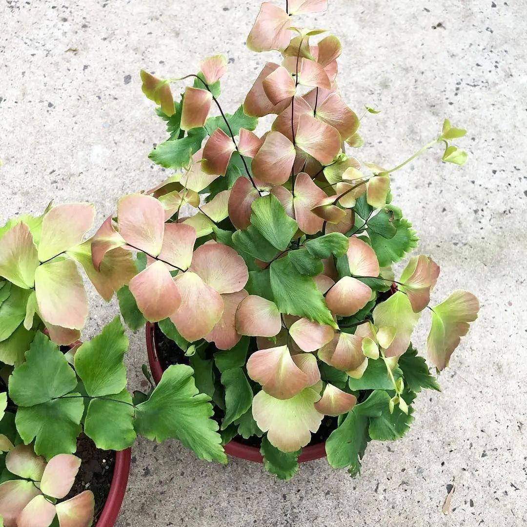 大叶铁线蕨是属于铁线蕨科铁线蕨属的一个品种,看上去非常有热带的风情,嫩叶呈桃红色,有着拱形的叶片,叶子成熟后会变成翠绿色,可以长成一丛丛。