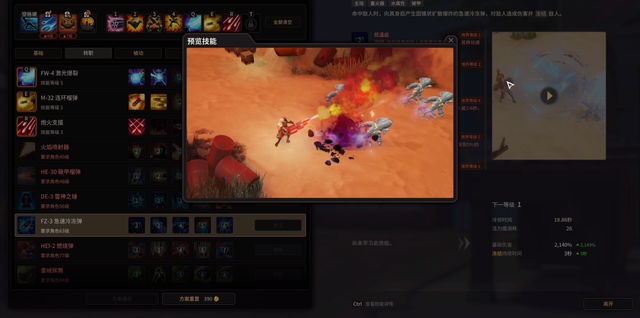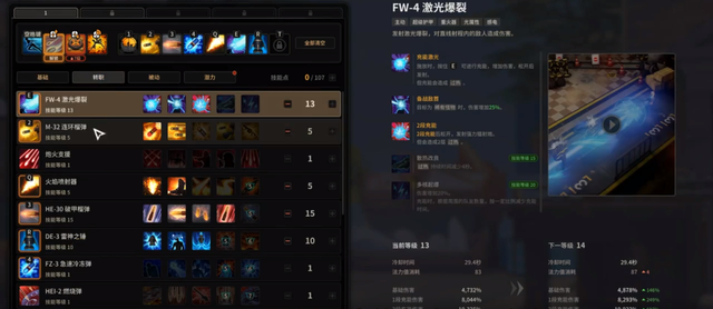 转职技能中,FW-4激光爆裂可以点到2、3级,这个技能刷图的时候非常好用。首先它具有超远的射程,以及范围内的AOE伤害。无论是怪多还是打BOSS的时候都很好用,顶替了前期加特林的地位。其次按E可以给其充能,造成更高的伤害,只不过充能会过热。是最主要的输出手段之一。