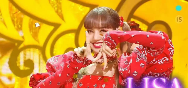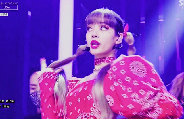 后来更有颠覆眼妆:大红色的眼影描边之鲜艳堪比烈焰红唇的色号,让她整张脸看着都红彤彤的。再加上绑得死紧的头发,打歌舞台镜头下的Lisa仿佛肿脸一般,将嘴大的劣势凸显得完完全全。