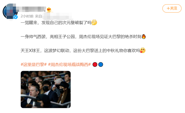 当地的官方媒体也捕捉到了天王周杰伦在现场的镜头,特地更新社交平台动态,还配文称:“一身帅气西装,亮相王子公园,周杰伦现场见证大巴黎的绝杀时刻,天王X球王,这波梦幻联动,这份大巴黎送上的中秋礼物你喜欢吗?”