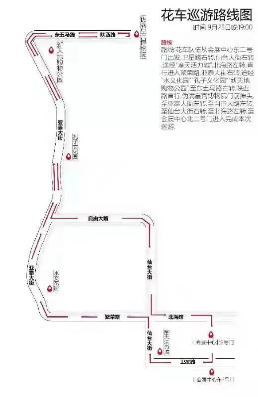9月23日晚巡游路线:花车队伍从会展中心东二号门出发,卫星路右转,仙台大街右转途经“摩天活力城”,北海路左转,直行进入繁荣路,亚泰大街右转,途经“水文化园”“孔子文化园““新天地购物公园”,至东五马路右转,陕西路直行,“伪满皇宫博物院”门前掉头,至亚泰大街左转,至自由大路左转,至仙台大街右转,至北海路左转,至会展中心北二号门进入,完成本次巡游。