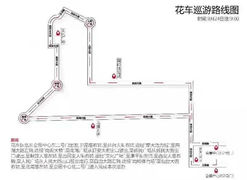 9月24日晚巡游路线:花车队伍从会展中心东二号门出发,卫星路右转,至仙台大街右转,途经“摩天活力城”,至南湖大路左转,途经“南湖大桥”,至南湖广场从延安大街出口驶出,至新民广场从新民广场出口驶出,至解放大路左转,至西民主大街右转,途经“文化广场”至康平街左转,至西安大路右转,至人民广场从人民大街出口驶出南行至自由大路左转,途经南岭体育场至仙台大街右转,至北海路左转,至会展中心北二号门进入,完成本次巡游。