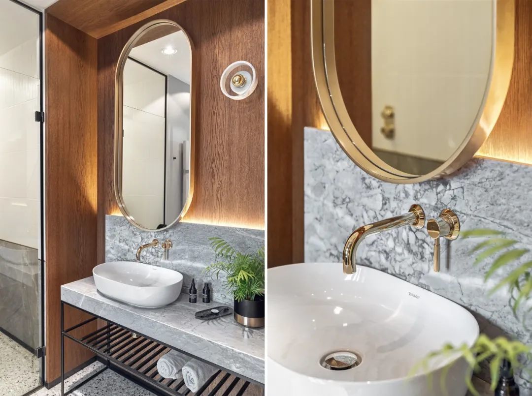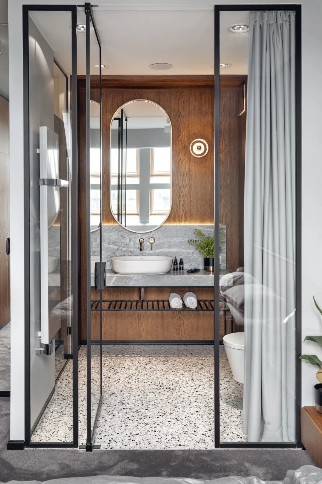 ▲主人卫生间以玻璃隔墙的设计,水磨石地面+木饰面的材质,台上盆与椭圆镜子的设计,也让卫浴空间显得更加华丽时尚而舒适端庄。