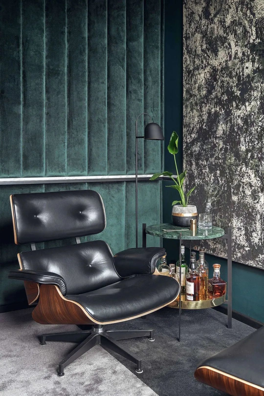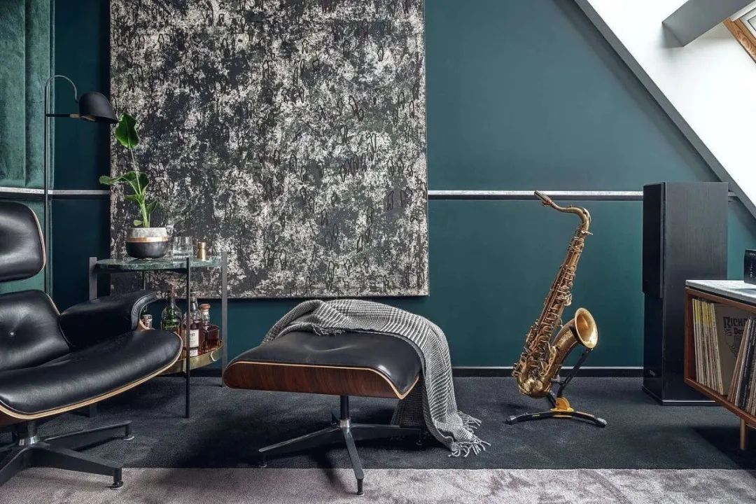 ▲墨绿色的软包墙面空间,布置舒适的皮艺休闲椅与靠脚凳,小边几上摆着花瓶与酒瓶酒杯,再放上萨克斯乐器,美酒与音乐的熏陶,生活无限美好。