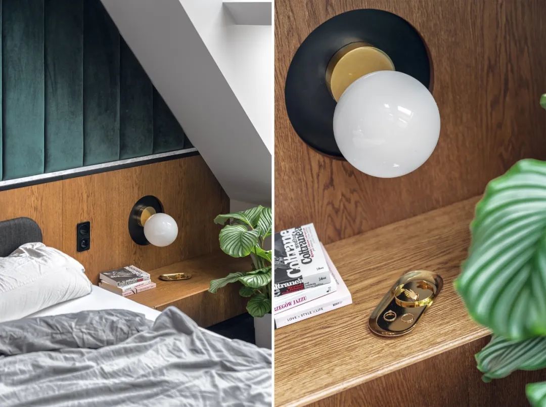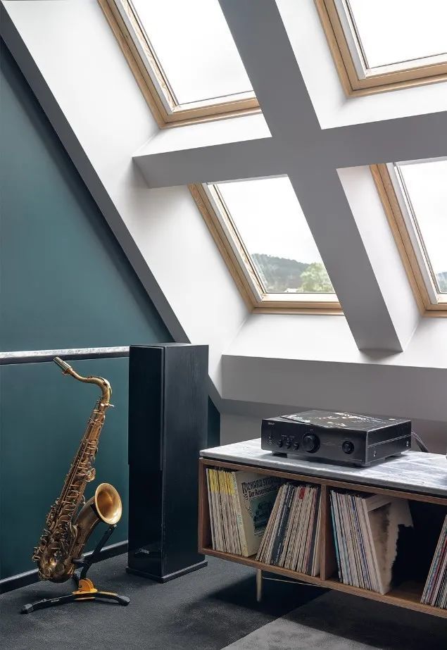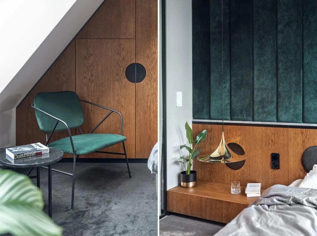 ▲卧室是斜顶的空间,床上是个大天窗,木饰面墙脚+墨绿色软包墙面,布置灰白配的床单,营造出一种自然舒适的文艺与休闲氛围感。