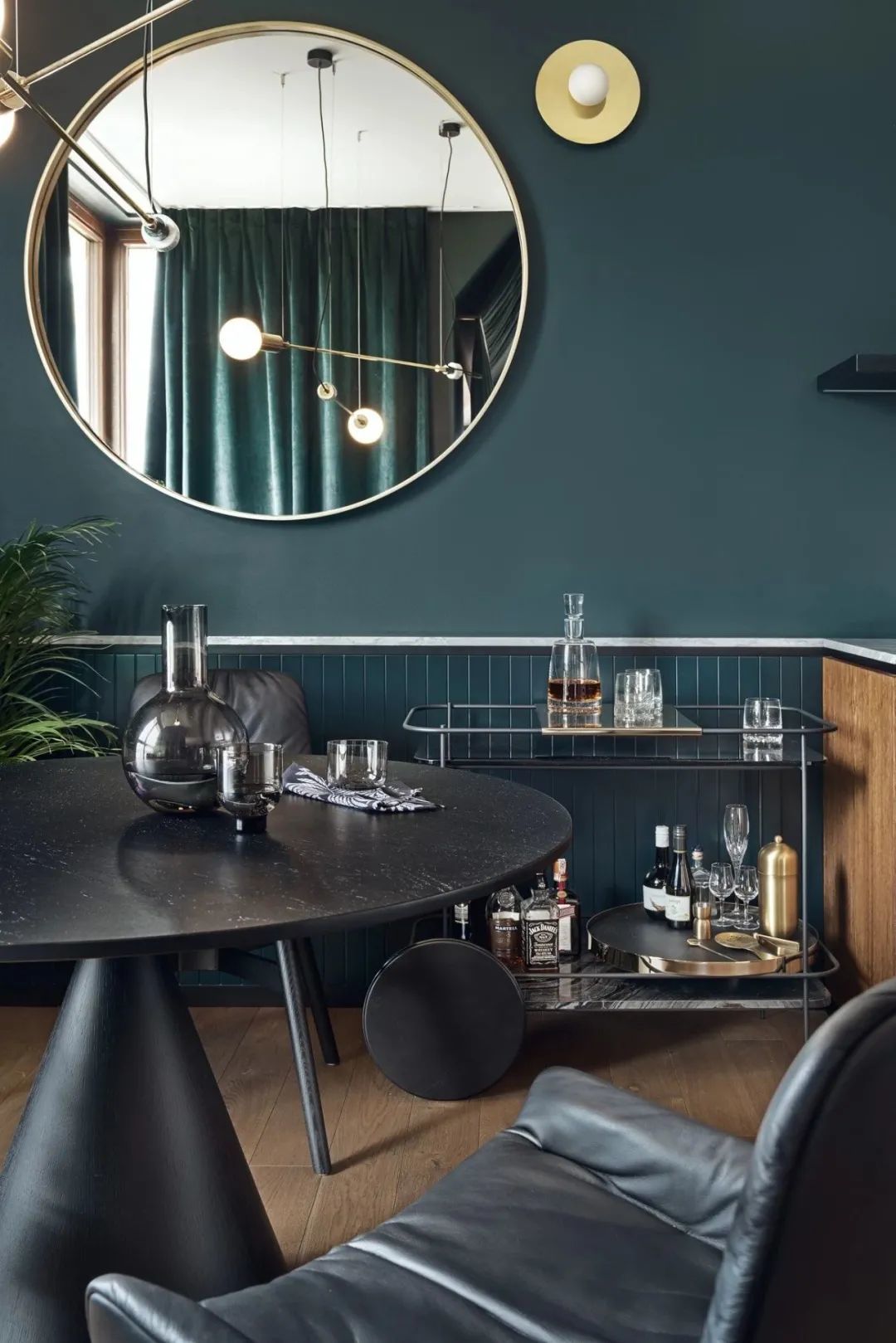▲客厅后方墙面也是暗蓝色的设计,加入一面圆形镜子,使得客厅整体感更加和谐自然。