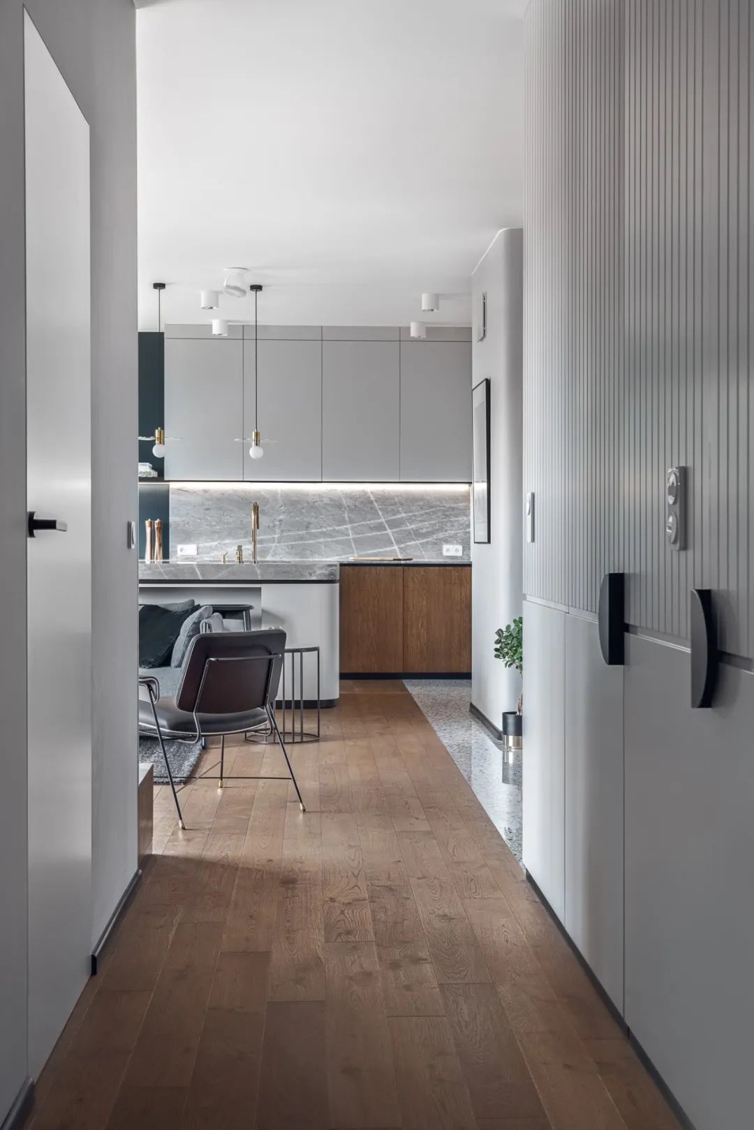 ▲走廊墙面以灰色硬包的墙脚,墙身的入墙式柜体则是加入了长城板造型的护墙板的材质,带来一个朴素优雅的生活空间。