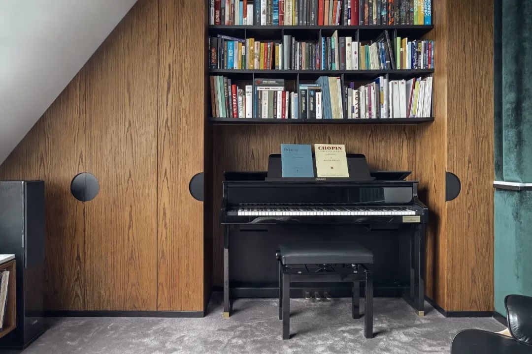 ▲书房以定制收纳柜,中间加入一个嵌入钢琴摆放的位置,上方装着开放式的书架,书架上摆满了主人爱看的书籍,让生活更加文艺有趣。
