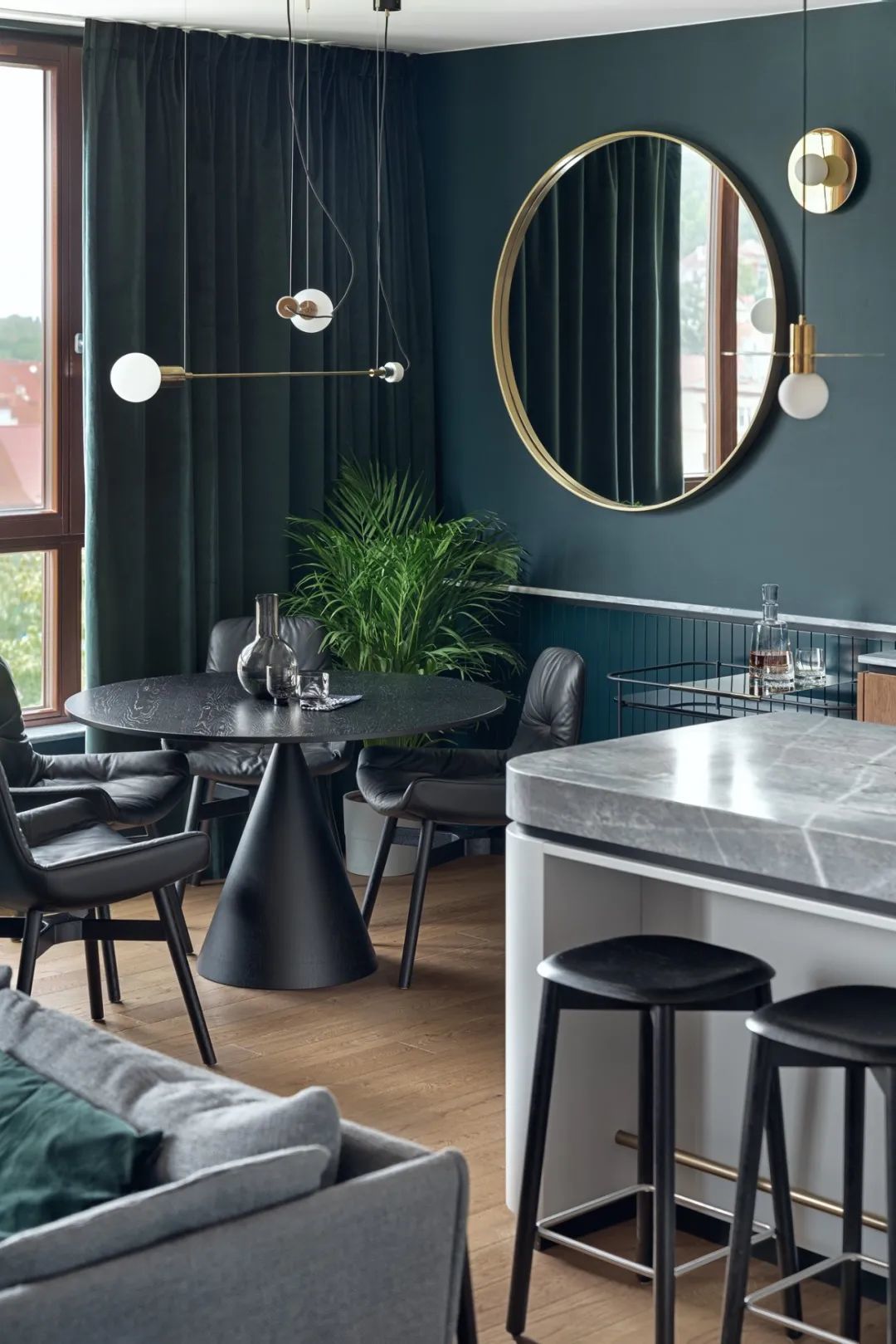 ▲餐厅以圆形的岩板餐桌台面,搭配上深灰色的皮艺餐椅,在暗蓝色的墙面与窗帘搭配下,角落还加入了一盆绿植,为我们提供了一种安静端庄的清新与舒适氛围。
