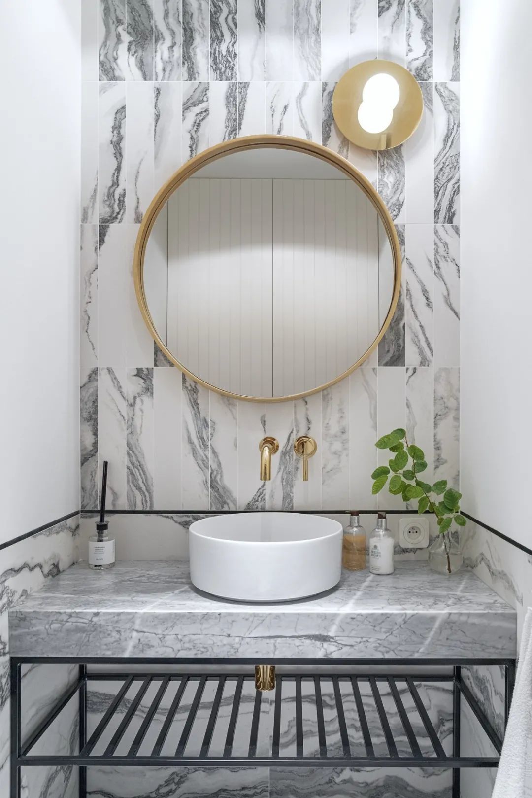 ▲卫生间的洗手盆下加入一个实用的收纳架,大理石台盆+圆形台盆洗手盆的设计,墙面是大理石纹理的墙砖,挂一面圆镜,布置香薰与洗漱用品,带来一个文艺优雅的洗漱空间。