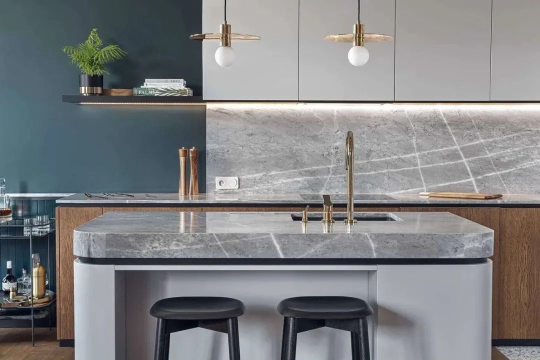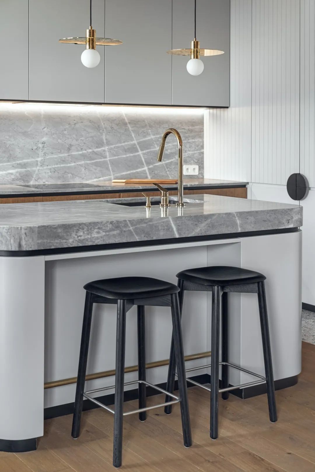 ▲灰色大理石质感的中岛台,加入水槽与金属龙头+吊灯,还有两张黑色的吧椅设计,也营造出了一个精致优雅的餐厨生活体验。