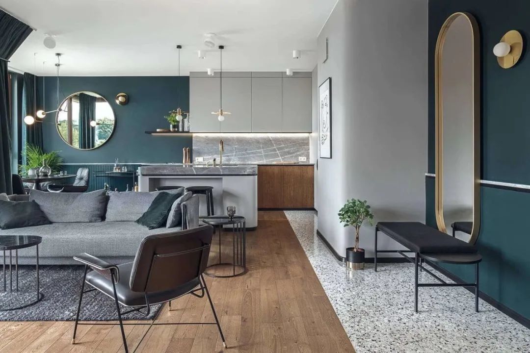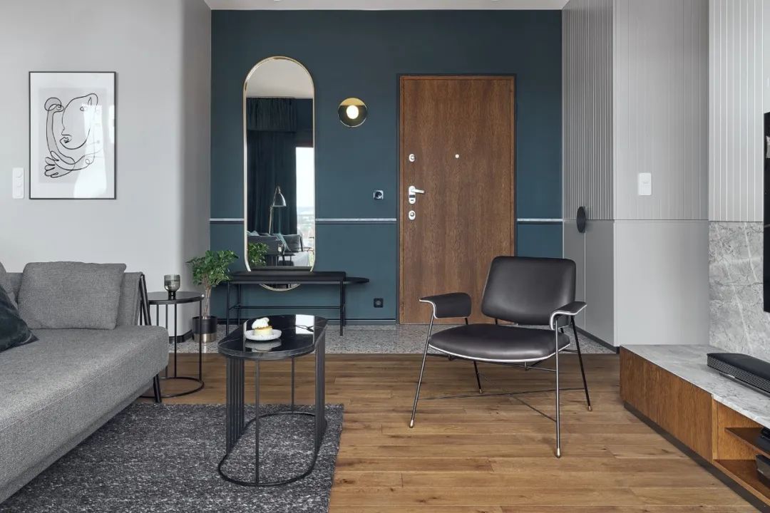 ▲在木地板的空间下,加入胡桃木色的电视柜与房门,暗蓝色的乳胶漆墙面,挂一面椭圆形的金属框镜子,还有黑色+灰色搭配的茶几沙发等家具,让空间显得安静端庄而舒适。