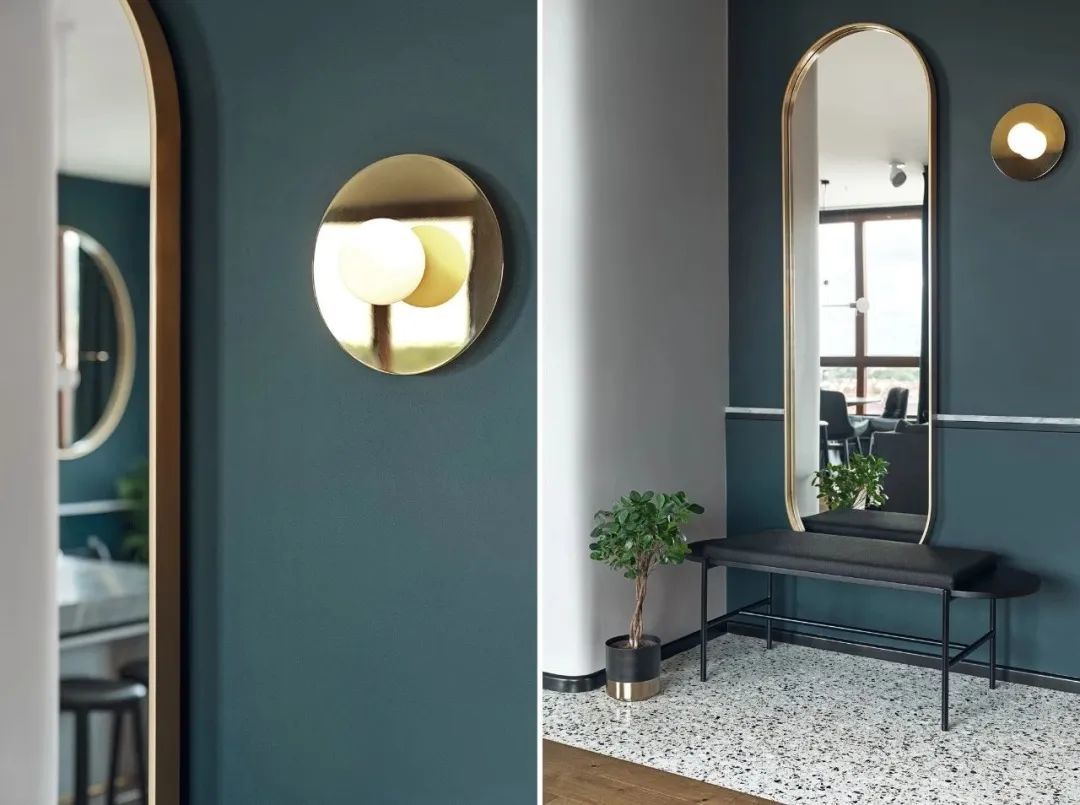 ▲玄关地面在水磨石质感的空间下,布置一张极简黑色的长板换鞋凳,后方挂一面椭圆形的全身镜+圆形金属底座壁灯,让玄关也更加精致有仪式感。