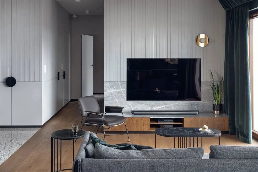▲电视墙以岩板为墙角,墙身加入护墙板材质,使得客厅空间充满现代优雅而精致的气息。