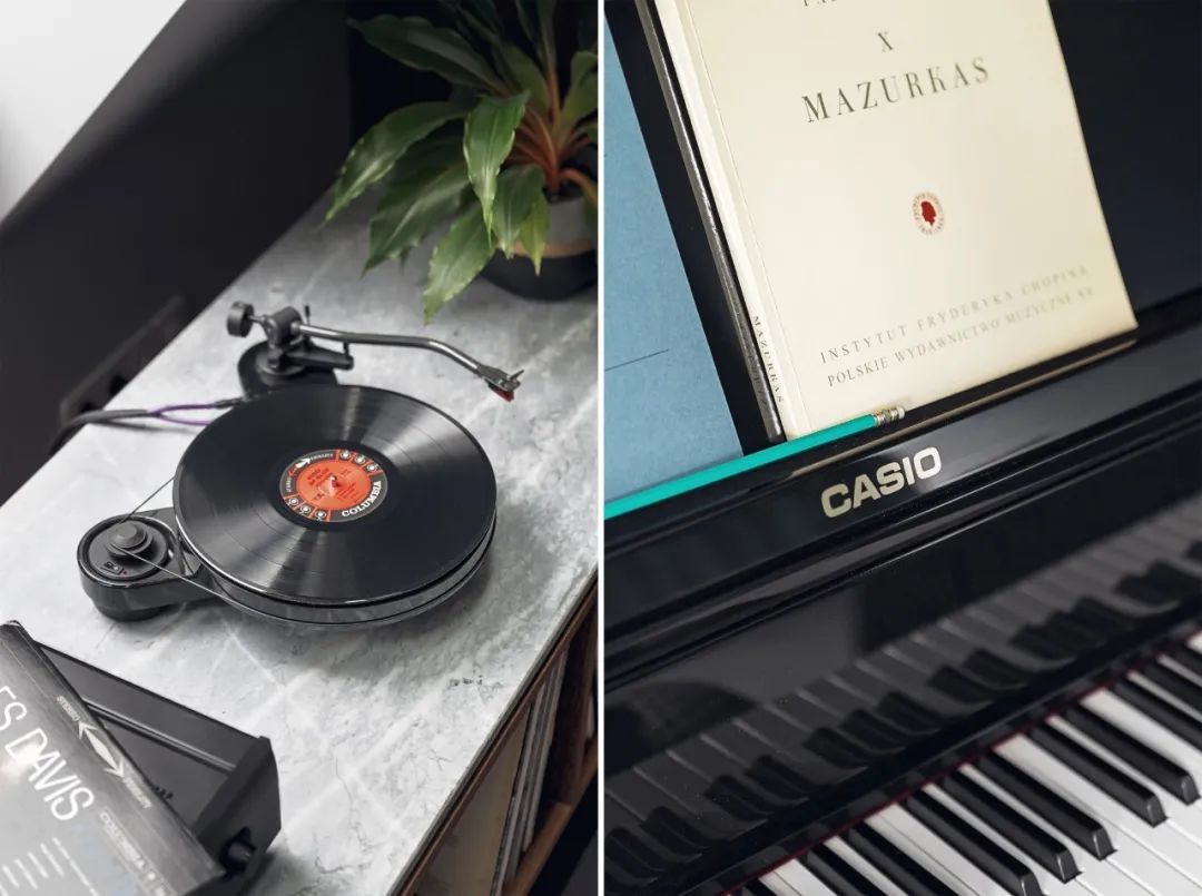 ▲黑胶唱片机、钢琴与萨克斯,可以看得出主人是一位热衷音乐的人士,同时在深色的质感搭配下,也把家布置成一个质感端庄的空间。