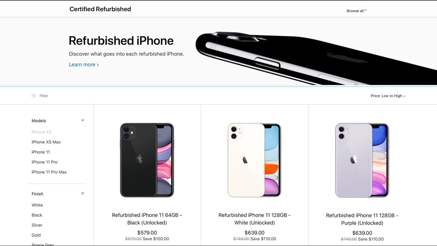 目前,加拿大用户已经可以通过 Apple 翻新商城购买 iPhone XS Max、iPhone 11、iPhone 11 Pro 和 iPhone 11 Pro Max 等产品。