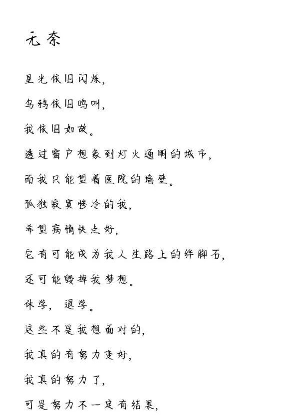 哭,只是一种常规的表现。小姑娘也还不止一次的想到了轻生,但毕竟是一个14岁的孩子,所以一直没有勇气去尝试。其实,医生的话,小姑娘也不是听不进去,也知道这样对自己非常不好,知道应该去说,去表达自己的真实情感,知道“微笑”和“美好”是虚伪的,并不能换来真正的快乐。 但同样也表示不想去改变自己的现状,或者说不知道如何去表达真实的情感,不知道怎么开口,也担心负面的东西会伤害到家人。医生鼓励她说不出来就写出来,用微信发给医生。于是小姑娘就写下了下面的一段话: