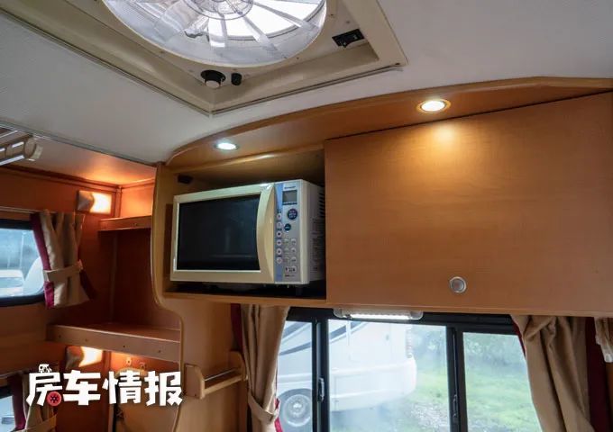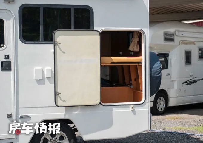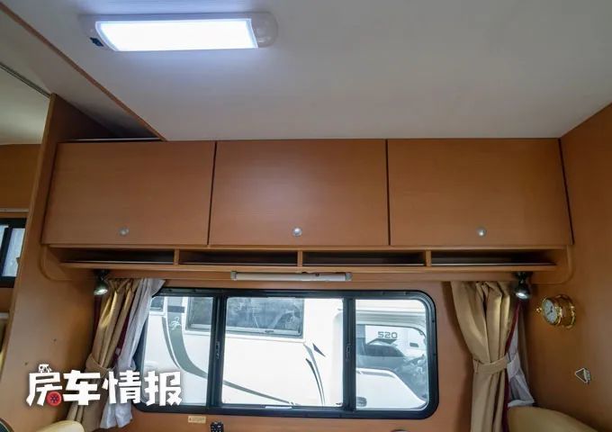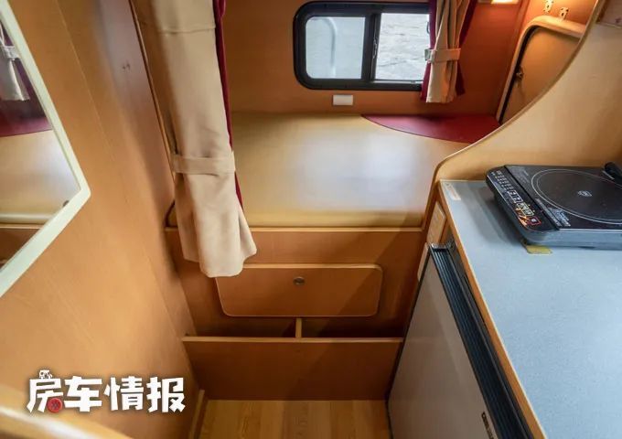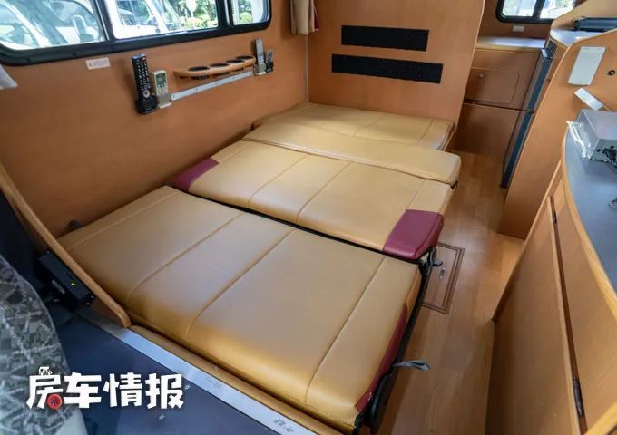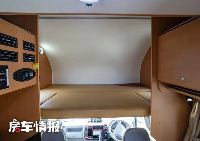 另外在前方的额头区域内还提供了一张额头双人床,也就是说整辆车一共提供了三张床,最多可以容纳6个人使用,不过平时如果额头床不用来居住的话,也可以存放一些被褥,提升整车的储物能力。