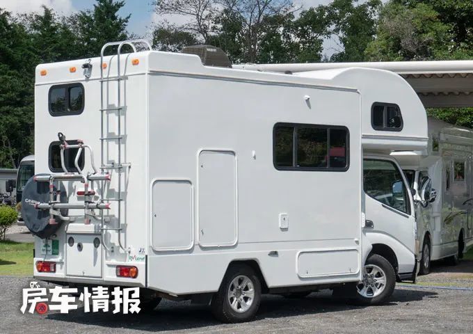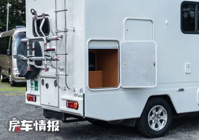 作为一款右舵车型,这款房车的遮阳棚位于车身左侧上方,车身外部虽然看起来像是包含了很多生活设施,但其实所有柜门内部都是储物空间,并不像我们国内轻卡房车外面所携带的超级丰富的生活配置,车身尾部看起来比较复杂,不仅带有爬梯和外置备胎,还提供了自行车架,可以满足更多用户的需求。
