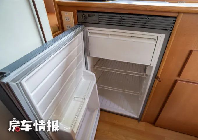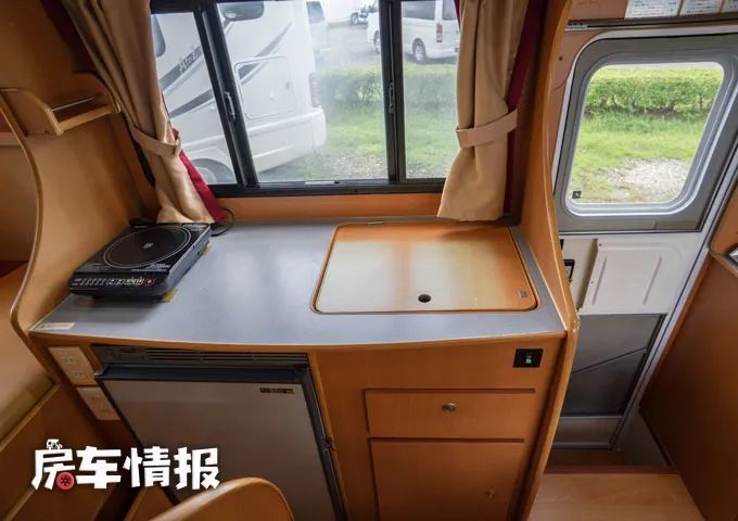 位于乘客门后方的厨房区配置了比较丰富的设备,包括台面上的带有翻盖的陶瓷面板洗菜盆,以及左侧的便携式电磁炉,还有下方一台90L的车载冰箱,另外顶部嵌入了一台微波炉,也可以满足多种烹饪需求。