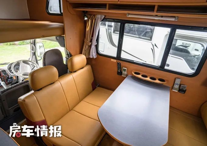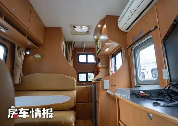 从左侧的乘客门进入车厢内部,可以看到整体的风格其实采用了日本房车比较普遍的一个设计,原木色的家具显得比较温馨,但是这样的家具的缺点就是既看不出新,也看不出旧,更加耐用一些。