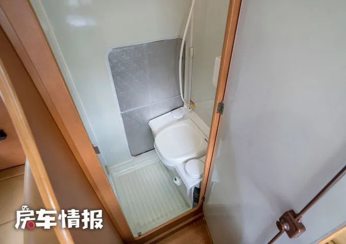与之相对的为全车的卫浴室,带有固定式的马桶以及淋浴花洒,最基本的洗漱需求还是可以满足的。