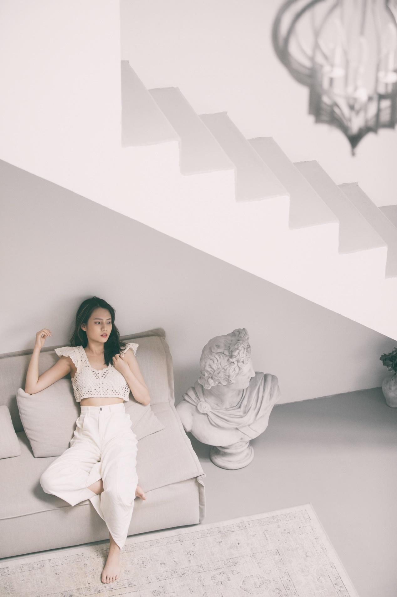 白色镂空针织上衣与同色直筒裤的搭配,看起来十分的简约干净,清新十足,秀出纤瘦身材的同时也保留了清爽少女气息,养眼也大方。