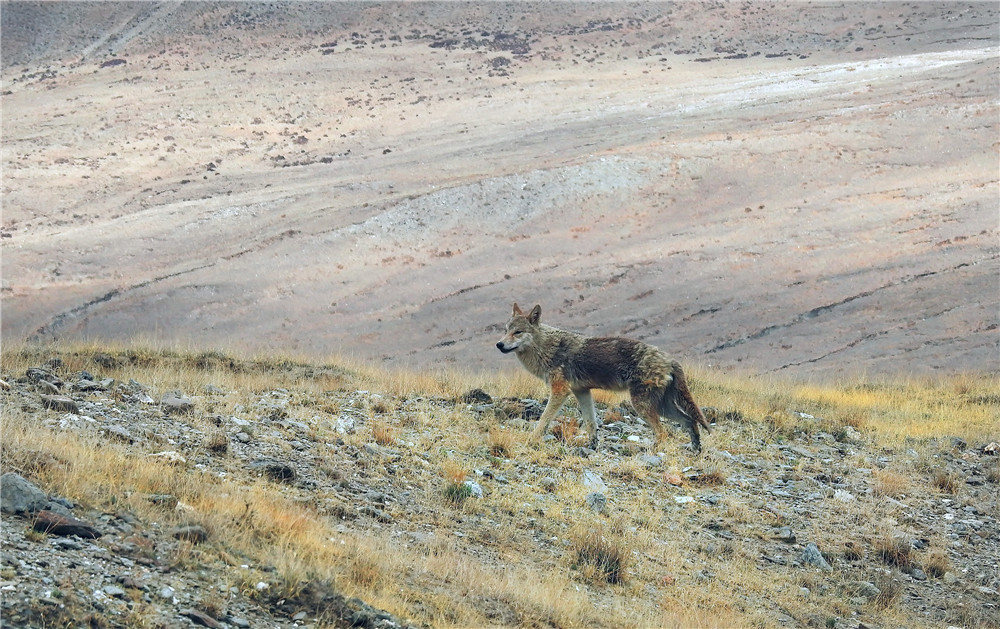那只狼终于现身,在山坡上徘徊,目光却紧盯着藏羚羊群,似乎在看有没有离群的小羊,好方便下手。