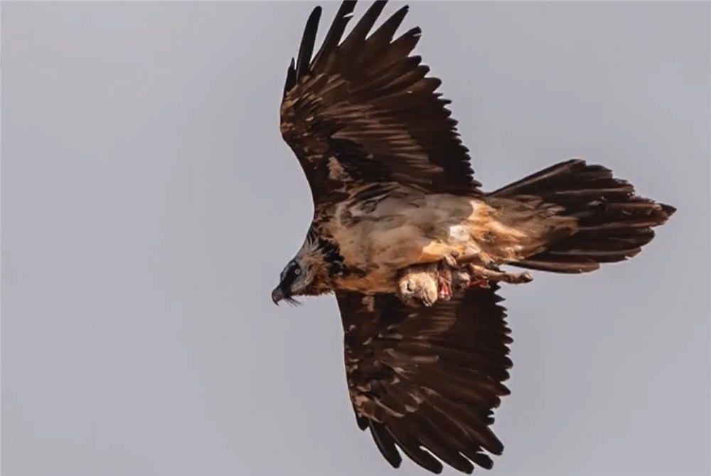 胡兀鹫的目光锁定在一只小羊上,从空中俯冲而下,眨眼间就掠过羊群,抓起了一只小藏羚羊,重新飞回高空中。