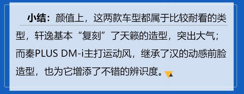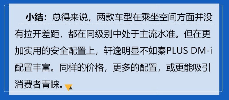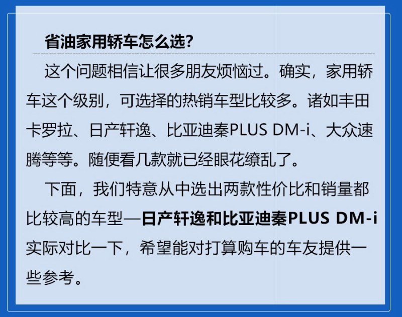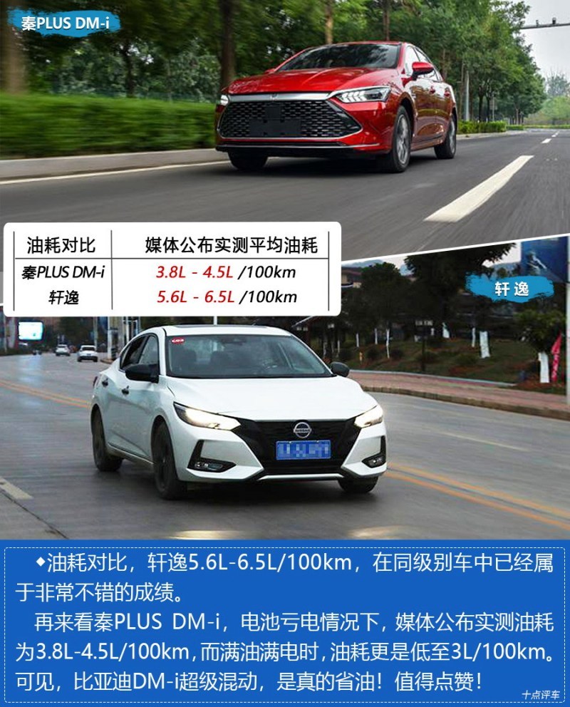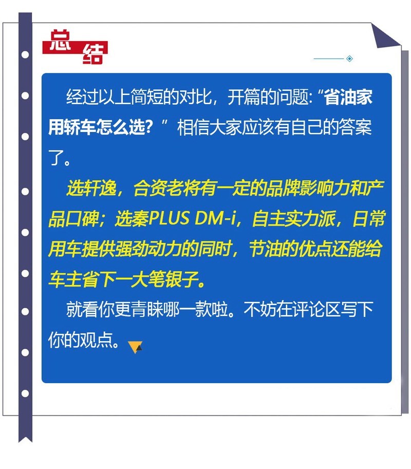 总结:经过以上简短的对比,开篇的问题:“省油家用轿车怎么选?”相信大家应该有自己的答案了。选轩逸,合资老将有一定的品牌影响力和产品口碑;选秦PLUS DM-i,自主实力派,日常用车提供强劲动力的同时,节油的优点还能给车主省下一大笔银子。就看你更青睐哪一款啦。不妨在评论区写下你的观点。