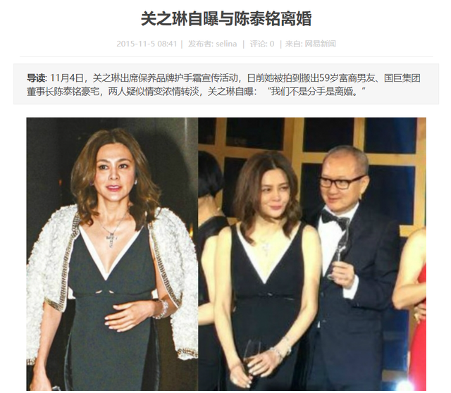2015年,媒体爆料关之琳陈泰铭分手,关之琳自曝:“不是分手,是离婚!”