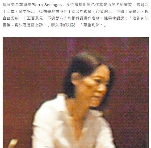 当年她秘密和已婚的学生家长陈木元交往,此画作者Pierre Soulages的生日与和她一样,所以是陈木元刻意买来送她,并非她向陈男借用,她拒绝退还。