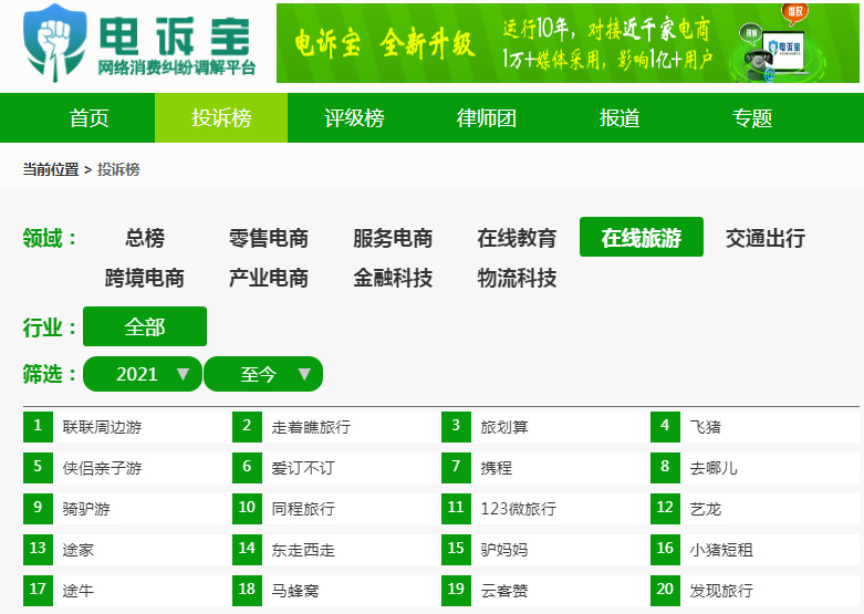 据“电诉宝”受理的在线旅游电商领域用户有效投诉显示(依据投诉量排行),飞猪排名第4位。此外,“电诉宝”2021年至今受理投诉中涉及的在线旅游平台有途牛、同程旅行、艺龙旅行网、携程、飞猪、去哪儿、马蜂窝、走着瞧旅行、联联周边游、世界邦旅行、侠侣亲子游、骑驴游、123微旅行、旅划算、发现旅行、驴妈妈旅游、麦淘亲子、小猪短租、蚂蚁短租、爱彼迎、爱订不订、周末酒店、OYO酒店。