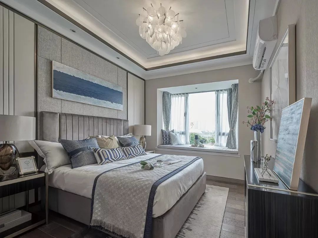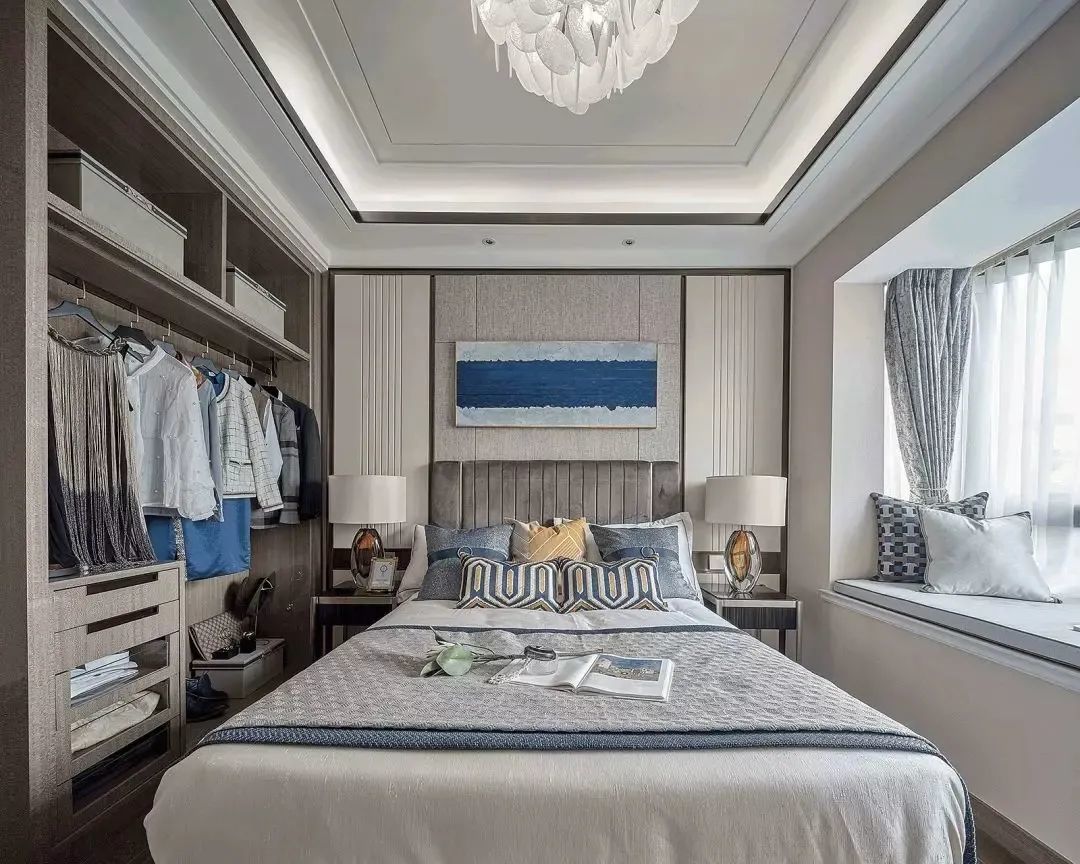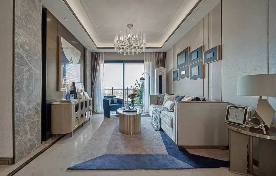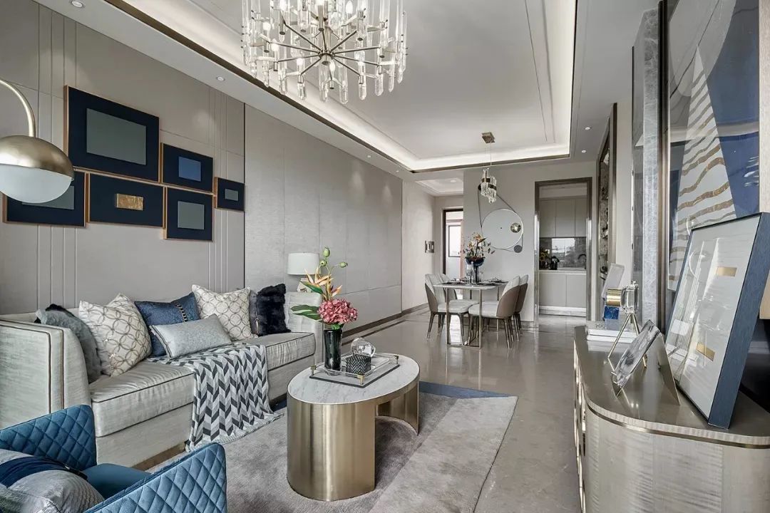 在这套95平米的现代轻奢风格装修案例中,整体空间加入安静色蓝色与白色元素,让空间充满宁静优雅的高级与华丽感,同时通过精致轻奢的金属细节点缀,让空间显得更加档次舒适而高级,呈现出一种惬意而华丽的空间氛围。