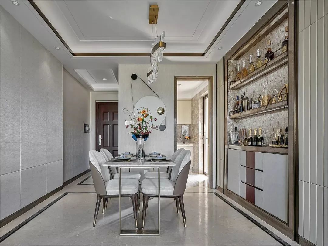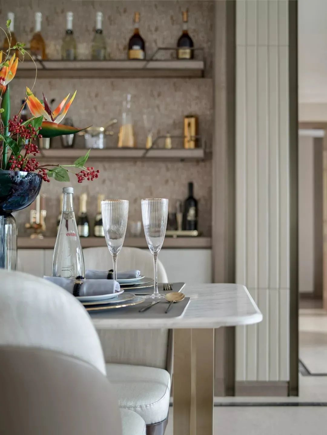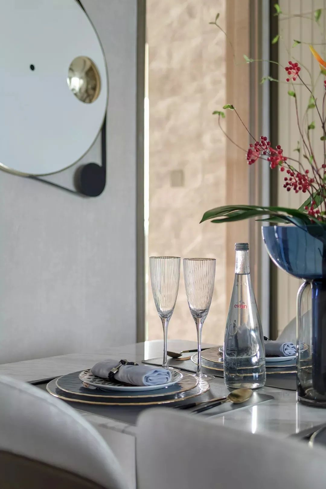 ▲餐桌上镜子的餐具与玻璃酒杯,与后方餐边柜上的酒瓶相呼应,带来一种现代精致的用餐仪式感。