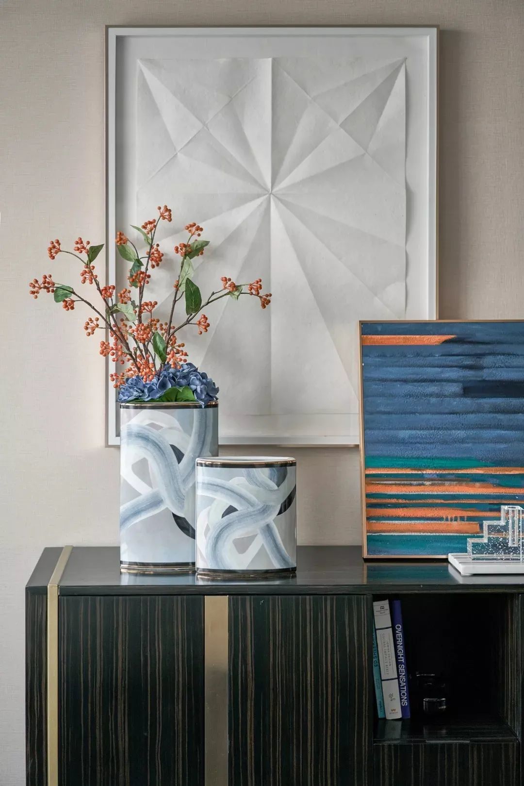 ▲床尾位置布置一个深色斗柜,加入挂画、独特花纹的花瓶与装饰画,花瓶与装饰画里都加入了橘黄色与蓝色的组合,让空间显得安静沉着而又热情活泼。