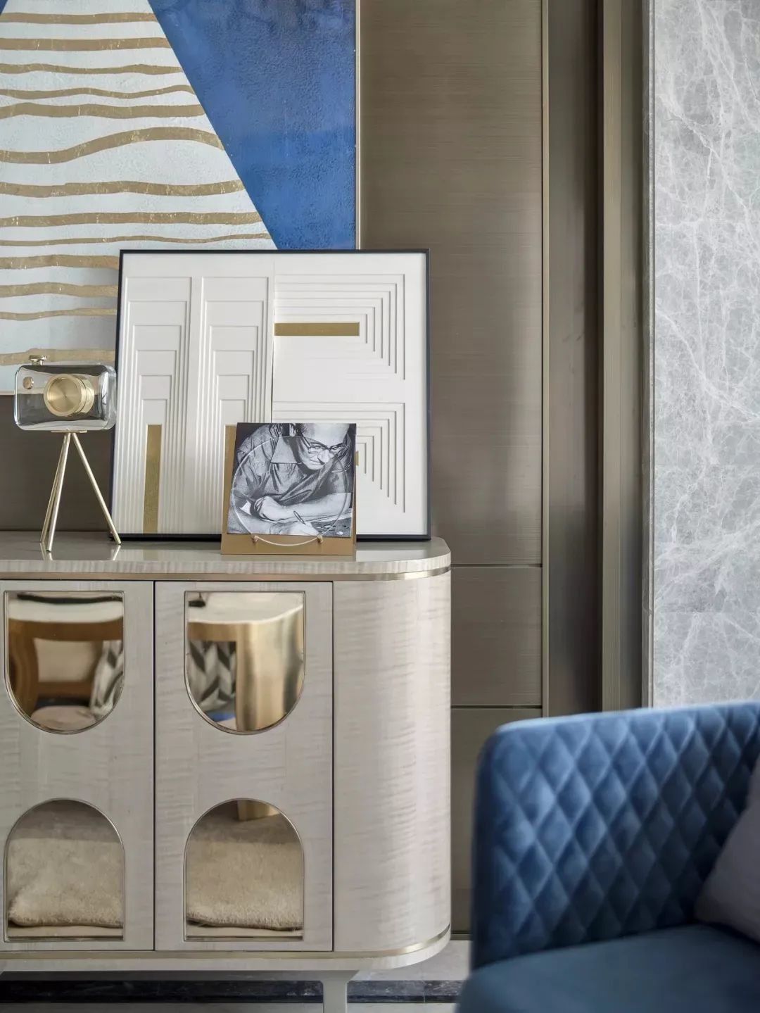 ▲电视柜上加入金属材质的点缀,加上蓝白金色组合的装饰画,让空间显得安静而华贵优雅。