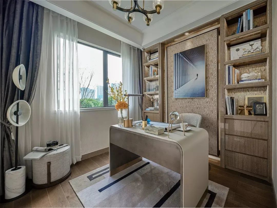 ▲书房中间地面铺上一席灰色调的地毯,摆上一张卡其色的成品书桌,后方以禾香板为背景墙面与柜子背板,对称的书架造型设计,在中间位置挂一幅立体感的装饰画,摆上书籍与摆饰品,也带来一个精致实用的高级空间感。。