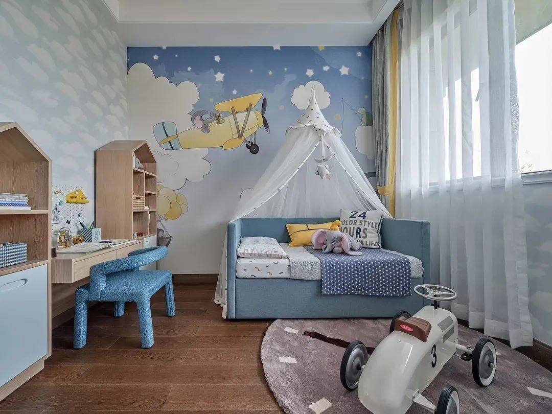 ▲儿童房的墙面是蓝天白云的梦幻主题画面的墙布,在蓝天白云的墙布上加入童趣的卡通飞机画面,布置带有床幔的梦幻可爱的儿童床,布置儿童书桌椅与书柜组合,书柜还是小屋造型的设计,使得空间感更加童趣高级。