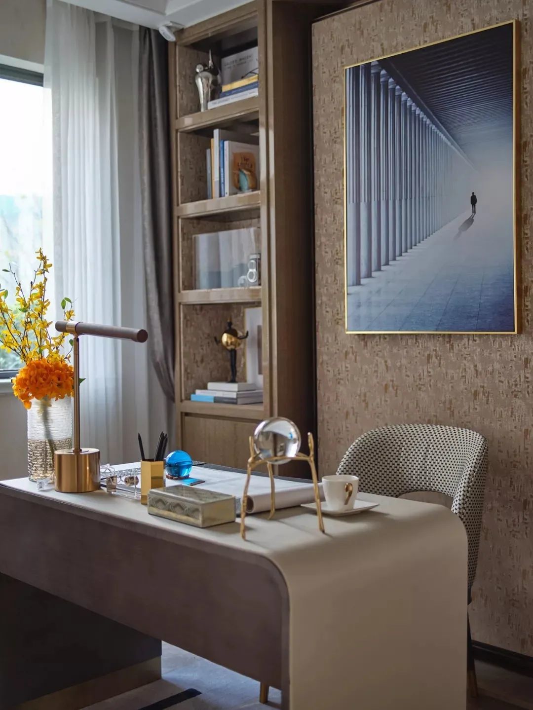 ▲书桌台面上的书本、笔筒、茶杯与花瓶等摆设,也让工作空间有着更加惬意优雅的体验。