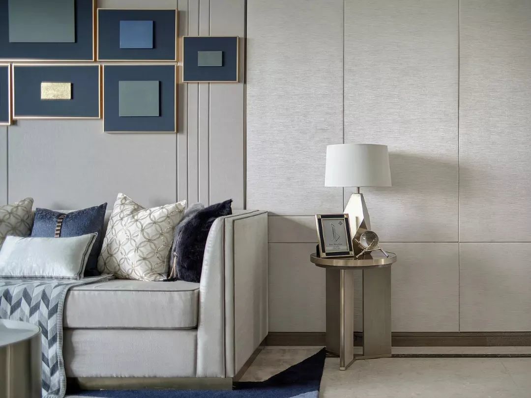 ▲沙发墙上挂一组深蓝色的装饰画,布置素色的抱枕让客厅充满高级优雅的档次。沙发旁边摆上一个金属材质的圆形小边几,布置台灯、装饰画,也让空间显得更加高级精致。