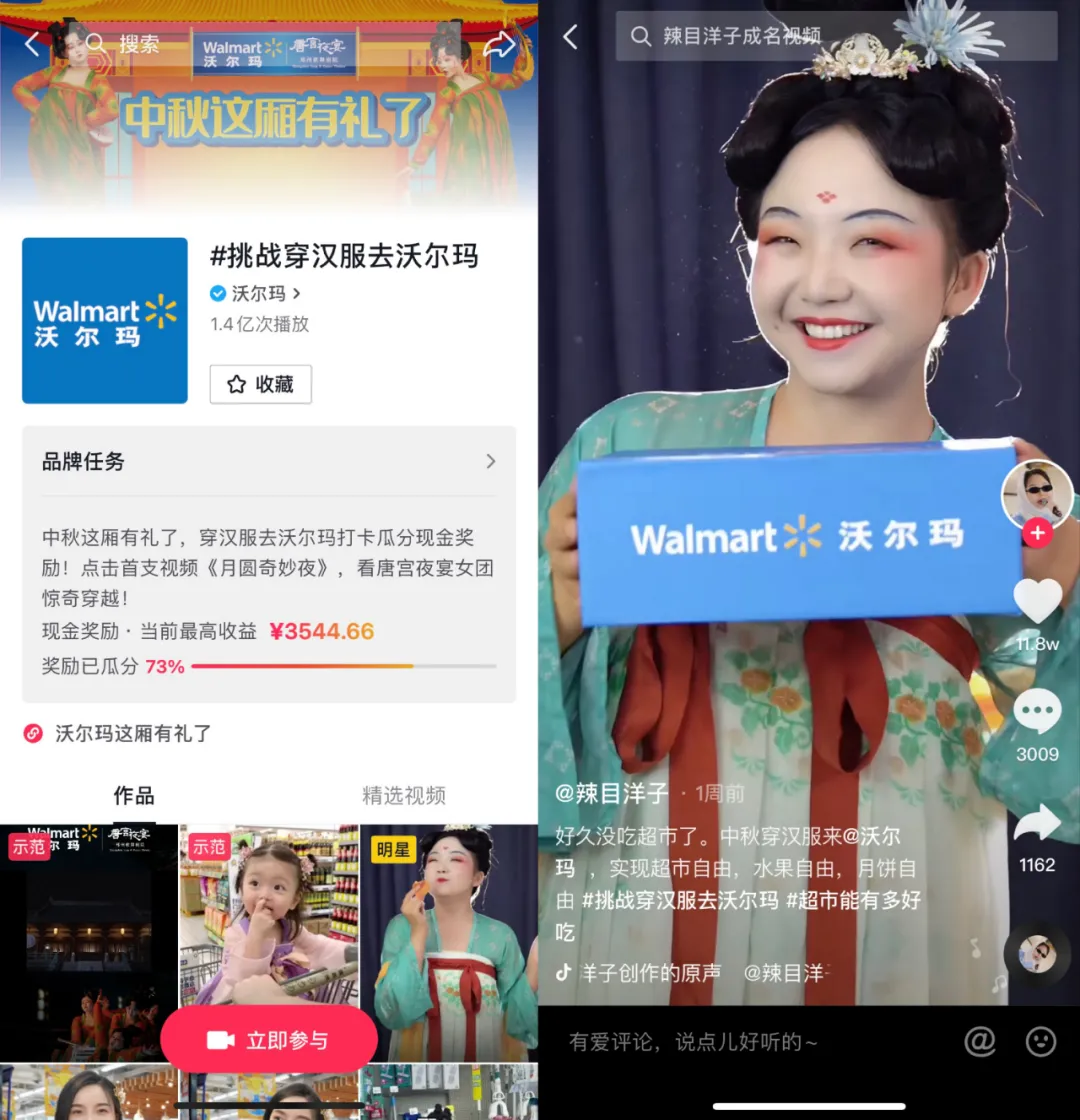 在短视频平台“挑战穿汉服去沃尔玛”的话题里,有超过2万个视频发布,俊男靓女纷纷在中秋节古装亮相沃尔玛,总播放量超过1.4亿。沃尔玛,成了新晋的国风打卡地。