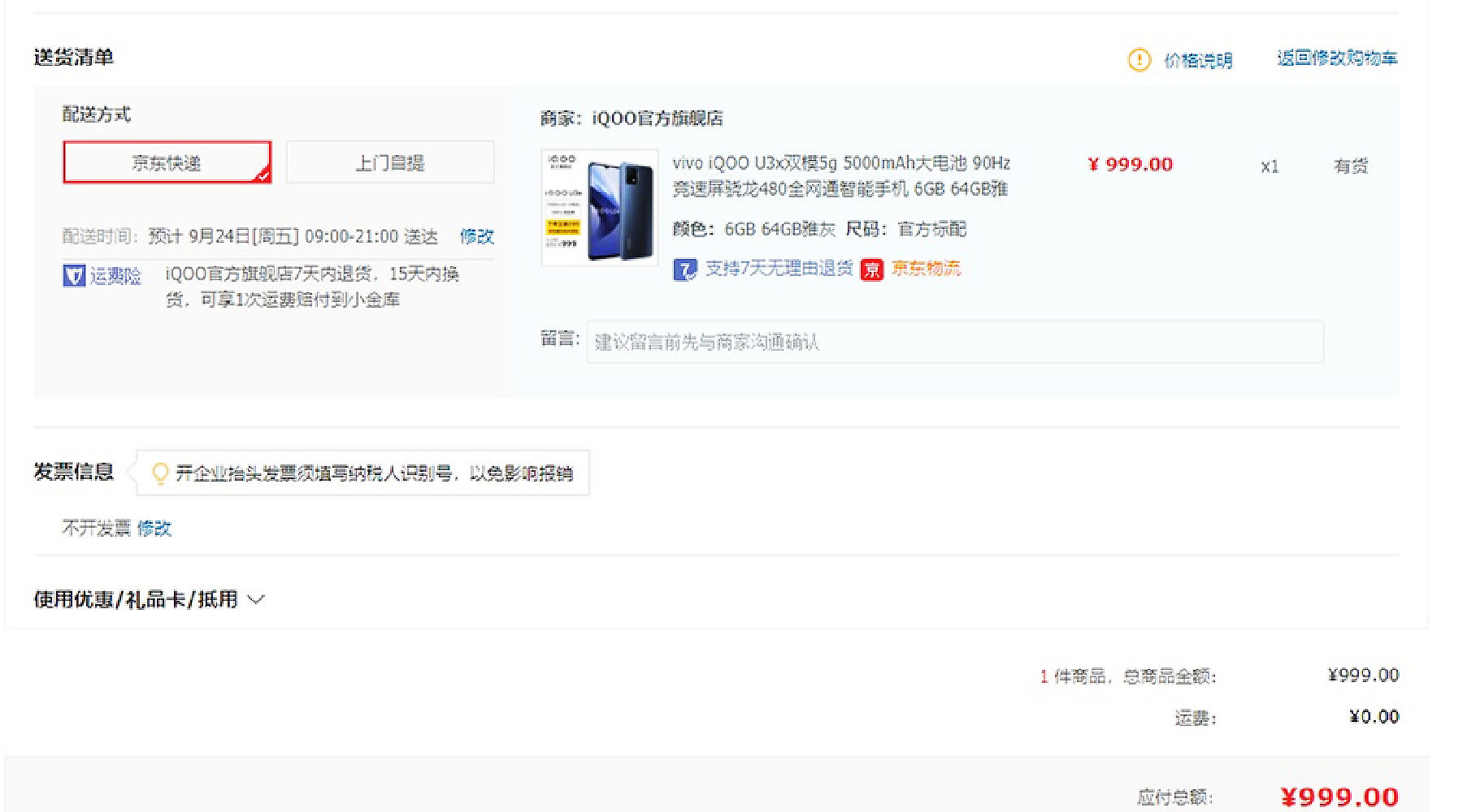 9月23日消息,iQOO U3x在京东自营平台开启限时秒杀模式:6+64GB到手价低至999元,学生认证用户还赠送闪充手游线。这款手机搭载骁龙480 5G芯片,拥有5000毫安时电池和90Hz电竞屏,机身仅有8.4毫米和185克,有需求的网友可以关注一下。