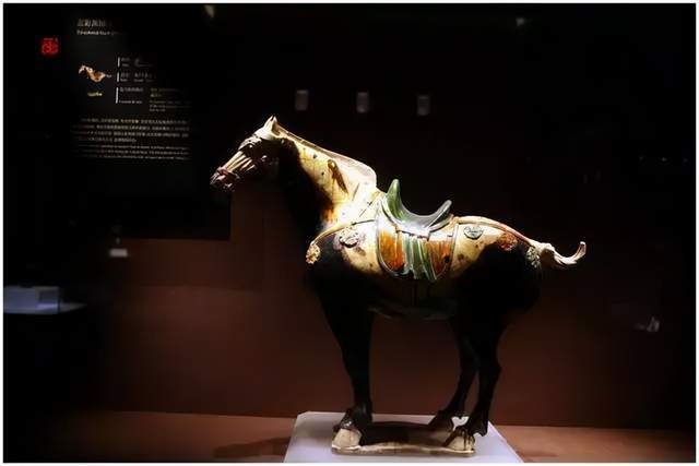 这匹“四蹄踏雪”的“龙种神驹”1981年出土于洛阳安菩夫妇墓。唐人爱马赞马,也以各种艺术形式描摹表现马,在深受人们喜爱的唐三彩中,就有许多精彩的马造型器物。黑釉马膘肥雄浑,骨骼健壮,造型有力。全身施以黑釉,而面部、鬃毛、背、尾、四蹄雪白。黑釉马形神兼备,雍容华贵,有很强的艺术感染力。唐三彩是一种低温多彩釉陶器,唐三彩中的“三”并非实指,事实上其釉色很丰富,但黑色三彩极为罕见。