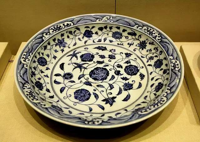 明宣德青花缠枝莲纹瓷盘,口径41.1厘米,底径27厘米,重2450克,侈口折沿、腹部微曲,平底,口沿饰波浪纹,盘内底和外壁饰缠枝莲纹,底部无釉并有火石红痕。用于烧造该瓷器的青花料是从伊斯兰地区进口的“苏麻离青”,这种青料含铁量高,所以会在青花部分出现黑色的铁锈斑,和浓艳的青兰色相映成趣,成为无法模仿的特色。该器色调浓郁,釉面肥厚莹润,并带“苏麻离青”青料烧造时“晕散”的典型特色,堪称明代宣德青花器中的代表作品。宣德时期是中国青花瓷器的黄金时代,宣德青花瓷以胎釉精细,色泽浓艳,造型多样和纹饰优美而著称,被认为是明代瓷器之冠。