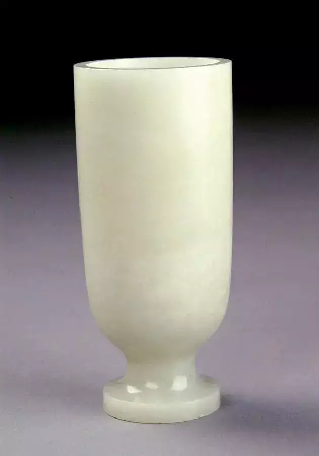 1956年洛阳出土,选用和田白玉雕琢而成。白玉杯高11.7厘米,口径5.2厘米、底径4厘米,背身呈直口筒状,底部是圆盘状矮足,大小类似于我们现在使用的小酒杯。整个玉杯光滑平整、线条流畅,没有任何纹饰,但雕工精美,口沿、筒身、底部转角处,无一不圆润明晰。经过汉末大动乱及群雄混战,社会经济凋敝,统治集团无力花费巨资经营丧事。另外,是怕陵墓被盗,自古至今,国家兴衰交替,亡国之后,陵墓往往被盗挖,墓里放的财宝越多,越容易被盗,所以不如薄葬。没有任何花纹与雕刻的白玉杯,就是曹魏时期推行薄葬的有力见证。