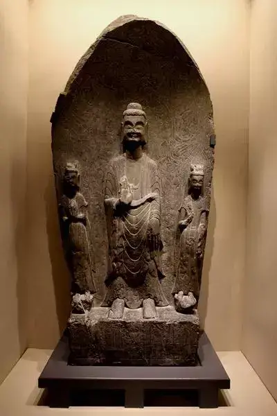 孔惠超石造像,石灰岩雕刻,为背屏式一佛二菩萨立像。北魏熙平二年(公元517年),通高206厘米,最宽处97厘米,厚15.5厘米。主尊高121厘米,面相长方,大耳贴面,着双领下垂式通肩大衣,内着僧袛支,右手屈肘于胸前施无畏印,左手下垂,掌心向内施触地印。跣足立于长方形台座上。二菩萨头戴宝冠,左、右侧菩萨分别高88、89厘米,上身赤袒,宽大的帔帛在两肩形成翘角,双手捧莲蕾屈肘于胸。莲瓣式背屏雕刻华丽,分5层雕刻,层与层间以细窄带分开。