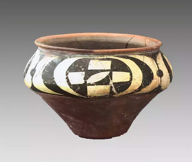 仰韶文化郑州白庄采集高21厘米 口径25.5厘米钵敞口,束颈,溜肩,鼓腹,腹以下渐收敛,小平底。泥质红陶制成, 肩腹部彩绘装饰图案。装饰图案先施一层白色陶衣,然后用褐彩描绘出三组方连图案, 图案由圆、方、月牙等相互叠错, 黑白对比强烈,极富有装饰性和节律美。