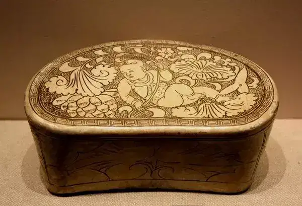 宋白釉珍珠地娃娃卧莲瓷枕,枕面纵19.5厘米,枕面横30.9厘米,高15厘米,为豆形,白地绘赭石色花,枕面周边饰回纹,中间刻划折枝莲花,一带兜肚婴儿,两腿一伸一蜷,仰卧在莲花之上,作玩耍状,画面空隙处布满赭石色小圆圈。前后壁均刻划有莲叶纹饰,后壁有一圆孔。底部无釉,胎呈灰白色。造型优美,纹饰繁缛,特别是枕面纹饰生动活泼,人物造型准确,具有较高的艺术价值,又是典型的登封窑器物。