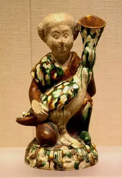 唐三彩抱鸭女俑,口径5厘米、底径13.4厘米、高26.5 厘米,其造型是一个怀抱鸭子、眉眼修长、稚气犹存、端丽活泼的少女。少女梳边髻、分头,面部丰满。身著窄袖长衣、袒胸、蹲跪于一圆形俯莲台上。怀中所抱鸭子,肥壮、羽毛丰满。女俑和鸭子身体中空,连为一体,似为插花器。女俑服饰及鸭子施色彩斑斓的三彩釉。女俑造型生动形象,栩栩如生,给人以呼之欲动之感。